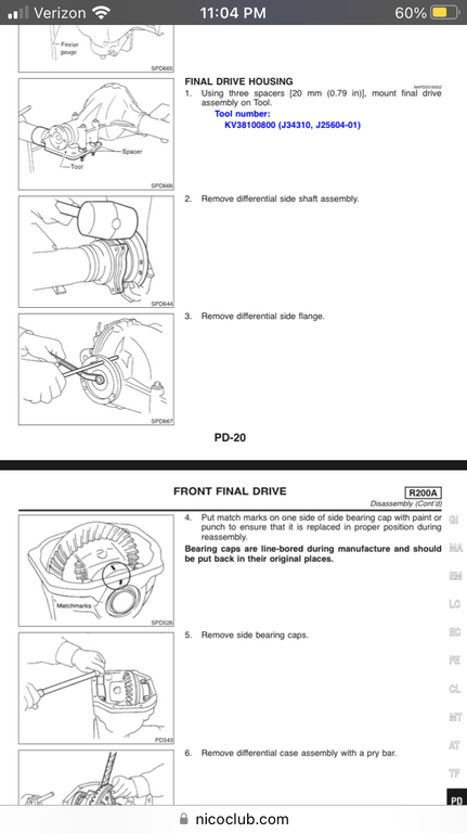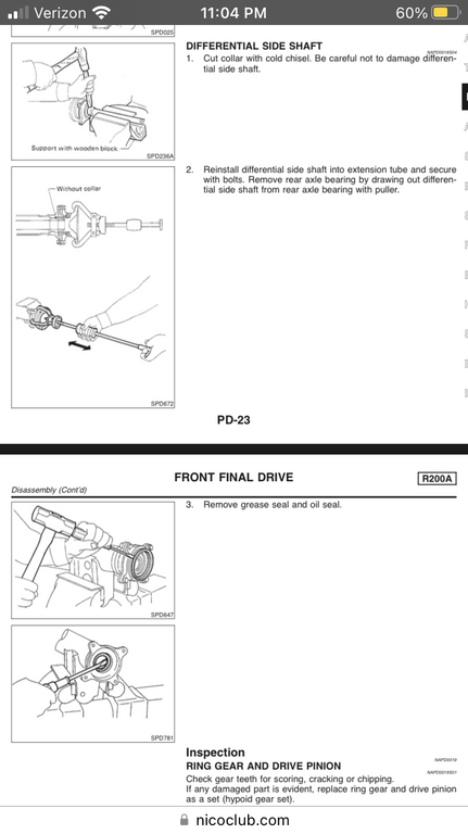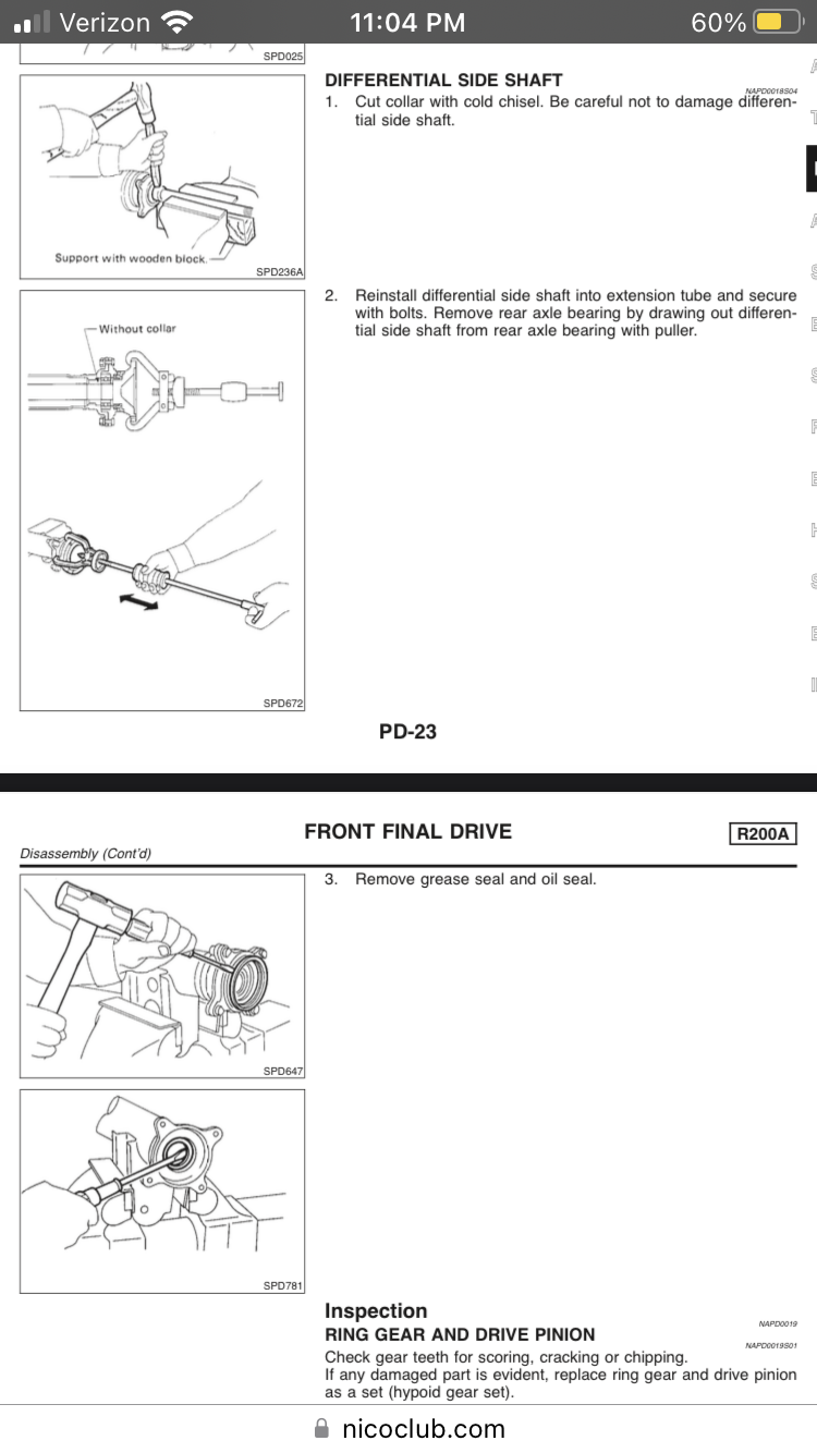 Yeah I think you’re right on the money. That inner oil seal is definitely failed as the gear oil is what I’m seeing leak at that seam. It remains to be seen whether the grease seal is also failed or not; let’s hope the grease seal is made of the same class of polymer or something similar that’s resistant to gear oils otherwise the oil might be eating away at it once it made contact. I’ve also heard (at least for wheel bearings) some people let their axles leak into the wheel bearings and give them a gear oil bath; I think it’s mainly done on 80 series and 100 series land cruisers if I remember correctly because the axles leak so much. Obviously a diff axle and hub wheel bearing assembly are different but I believe in our case both are the tapered style bearings. Theres also the possibility even if I see oil leaking past the front side of the grease seal it’s not the end of the world as it was only meant to hold grease back and something like gear oil being less viscous might be able to leak past pretty easily. I think what I’ll try to do is check the condition of the grease seal and with the side axle removed, try to lubricate the backside of that axle bearing if there is an opening to do so. I’m worried about degreasing it when I’m not actually cutting the collar and removing the bearing. If I can only get grease at it from one side I likely won’t be re-greasing the entire internals of the bearing. So supplemental grease without degreasing would be ideal in my eyes. Unfortunately a cold chisel, slide hammer, and axle press for the new collar are not apart of my toolset and I would be worried about screwing it up if I tried and alternative tool on such a crucial component. Also I might have confused you with the FSM, I’m not dropping the diff just getting at those seals since I will have my CV axles off when replacing them. From what I can tell there the side axle should come right out without needing to open the diff case up at all. It’s just those bolts holding the extension retainer on. Sent from my iPhone using Tapatalk