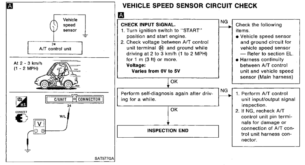 @Slartibartfast Thanks for the super helpful response! I followed the diagnostic flow charts in the service manual (relevant pages seemed to be EF&EC-38, EF&EC-39, AT-39 through AT-42, and wiring diagrams on AT-36 through AT-38). You're right on the money, ECM has a code for 14--vehicle speed sensor. Going through the diagnostics in the AT section showed that "Vehicle speed sensor circuit is short circuited or disconnected" (AT-40). This prompted me to check the voltage at terminal 24, see attached screenshot from the manual. I'm a little confused by this check--am I supposed to measure the voltage at the harness when it is disconnected? Or am I somehow supposed to measure the voltage at this terminal when the harness is connected to the control unit (not sure how I would do the latter)? I disconnected the harnesses from the A/T control unit and measured the harness side voltage while my dad was driving 1-2 mph. I was seeing readings of 1-3 V, which supposedly is normal according to this flow chart. The spec of 0-5V shown in the flow chart seems super vague though. Any ideas on where to go next? One other thing I noticed: the diagram on AT-38 shows the vehicle speed sensor going through the speedometer before going to the ECM and A/T control unit. So since my speedometer isn't working, and yet my A/T control unit is apparently getting an acceptable signal (if I did the test correctly), wouldn't this narrow the problem down to the speedometer servo motor (or whatever physically drives the needle)? Although this wouldn't explain the engine code...- 15 replies